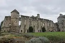 Carlos I y Carlos II también visitaron Falkland. Sobreviven relatos de la estancia de Carlos II en julio de 1650, cuando hubo que hacer proclamas para reducir los precios inflados de alojamiento y alquiler de caballos que se cobraban en el pueblo.[52] Un incendio destruyó parcialmente el palacio durante su ocupación por las tropas de Cromwell, y rápidamente cayó en ruinas.