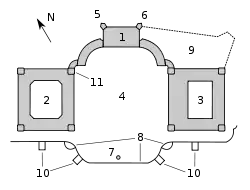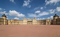 Una combinación de los enormes edificios como una elegante plaza central crea una composición orgánica característica de las ciudades fortaleza y de las residencias suburbanas. Uno de los elementos que crean una sensación de un castillo fortificado está constituido por las murallas ypor los dos bastiones «protegidos» por puentes que pasan por encima del foso. El perfil de la muralla se configura como un espejo de la fachada sur, cerrando la plaza proyectada para los desfiles militares y revista de las tropas.