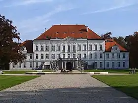 En este lugar ha habido un castillo al menos desde 1281, cuando aparece mencionado en fuentes escritas. Ese primer castillo fue destruido durante la Guerra de los Treinta Años y no fue reconstruido hasta 1660. Entonces se edificó un palacio barroco en el lugar, que fue el núcleo de la edificación actual. Fue renovado entre 1747-1750 en estilo rococó y se ha mantenido prácticamente sin cambios desde entonces. En ese momento la finca pertenecía al conde Sigmund von Haimhausen, un industrial, político y cofundador de la Academia de Ciencias y Humanidades de Baviera, que murió sin herederos. Después de su muerte, la propiedad fue vendida a James Eduard Haniel, que transformó el parque de la finca en un jardín paisajístico inglés. Los descendientes de Haniel todavía dirigen una fábrica de cerveza ubicada junto al palacio. En 1794 se vendió de nuevo. Siguió siendo una residencia familiar hasta la década de 1930, cuando el costoso mantenimiento de los edificios llevó a su abandono como hogar.[5][6]