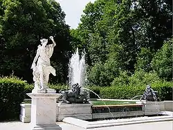 Ante el palacio se despliegan a la manera del absolutismo unos bellos jardines con laberintos, enormes fuentes decoradas, setos recortados y un embarcadero privado.