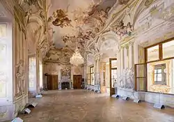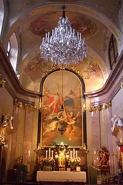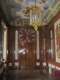 El techo de la nave está adornado con frescos de Daniel Gran, - no como se basa erróneamente en una firma que se encuentra en la bóveda a la derecha sobre el altar mayor ("P. Jo. Wiedon P. Arquitecto 1744" [Nota: Franz Josef Wiedon pinxit Architecturam]), fue adoptado por Franz Josef Wiedon. La pintura del altar mayor es de Johann Karl Auerbach (1722-1788), hijo del pintor de cámara y corte Johann Gottfried Auerbach. Los locales en los que se encuentra la iglesia del castillo fueron renovados en 1994-1999. En 2000 se realizaron más trabajos.
