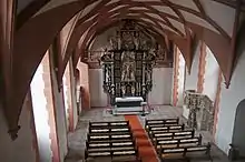 En las cuatro esquinas del patio hay unas pequeñas torres redondas en las que se encuentran las escaleras. La iglesia o capilla del palacio se halla en el ala norte y se extiende a través de la planta baja y superior, con una bóveda de crucería que hace referencia al estilo gótico. El altar de la capilla, hecho de alabastro y mármol, es de Hans Junckermulti. Cuenta con una estatua de Johann Schweikhard von Kronberg, sosteniendo una maqueta del palacio.[2]: 74