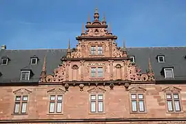 El palacio está construido con piedra arenisca Buntsandstein, especialmente de las canteras de Obernburg y Miltenberg. Aunque los muros exteriores están desprovistos de ornamentación, se agregaron numerosas esculturas artísticas a los frontones y las puertas de entrada.[2]: 74