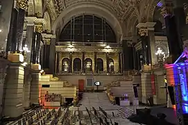 El acceso al edificio por la entrada principal conduce al Gran Salón (o Gran Vestíbulo), ubicado en el centro del edificio, un espacio notable de 40 x 18 metros y una altura de 24 metros diseñado «para dejar una impresión única en el visitante».[2] Su diseño, imitando la arquitectura interior de las termas Antoninas (los baños romanos de Caracalla)[6] en armonía con la bóveda pintada, le confiere un aire clásico. El color dominante de la sala, que reúne la mayor parte del enfoque artístico interior del edificio, es el dorado. Unas escalinatas a ambos lados conectan al vestíbulo con el primer piso, uniendo los despachos de las dos alas; en su día servía, entre otros, como sala de espera para el público, pero ya no tiene esta función.[2]