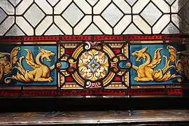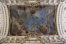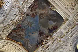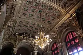 Un fresco alegórico de 200 m² cubre gran parte de la bóveda central, con el motivo del Triunfo de la Justicia, rodeado de decoraciones varias de color dorado. El elemento céntrico de esta obra de Károly Lotz, quien la basó en la pintura de Andrea Pozzo en la iglesia de San Ignacio de Loyola de Roma,[3] es la Dama de la Justicia en su gloria divina, rodeada de figuras alegóricas del poder protector de la ley y el derecho.[2] El fondo de la pintura retrata la bóveda como si fuera una ventana de cristal, sobre la cual se distingue la continuación del edificio con dos grandes arcos a ambos lados, y por encima de todo un cielo nublado. Las representaciones de la Justicia y algunas de las figuras posan en lo alto de un ático que también forma parte del edificio, mientras que el genio que imparte la justicia aparece al otro lado del fresco, directamente enfrente, también posado rodeado de figuras en un pedestal de la misma altura.