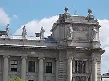 A ambos lados de la cuadriga, encima de pedestales que parecen unirse a las simas del frontón por unas prolongaciones en relieve, se presentan dos figuras sentadas, una representando al legislador y la otra al guardián de la ley, ambas obras del escultor János Fadrusz.[5] Los tres pedestales forman parte del ático de la estructura. Las otras muchas figuras que adornan la fachada y la azotea son personificaciones de las distintas artes y ciencias, obras de varios artistas, como József Róna, Gyula Donáth, Richárd Füredi o Béla Strohoffer.[3]