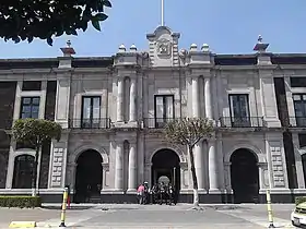 La fachada es de estilo neocolonial recubierta de tezontle y cantera a la manera de los Palacios del S. XVII de la ciudad de México, es decir, combinación roja con blanco. Está compuesto de dos patios con amplias escaleras y anchos corredores.