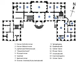- en la sala imperial, en la que el tejido italiano que recubre las paredes se estima en 140 euros por metro cuadrado, se expone un retrato del emperador Francisco I de Austria y de su esposa María Teresa I de Austria, padres de María Antonieta, quien testimonia el apego del ministro Ferdinand von Plettenberg a estos soberanos de Austria de la casa de Habsburgo;