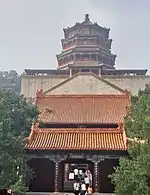 ![]() Vista de una parte del Palacio de Verano con el Barco de Mármol, la Pagoda del Buda Fragrante y una parte del gran corredor, vistos desde el lago Kunming. | ||