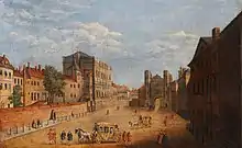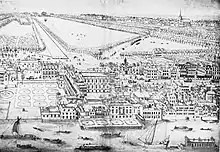 ![]() El Palacio de Whitehall por Hendrick Danckerts (c. 1675), visto desde el St. James's Park al oeste. La Banqueting House está ubicada a la izquierda. | ||