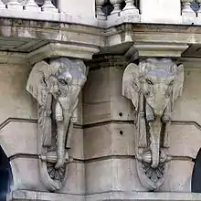 Los alzados se organizan verticalmente mediante pilastras de caliza marmórea con juntas rehundidas, colocadas simétricamente en los extremos y el centro de cada fachada. Coinciden con los lugares singularizados donde se sitúan los arcos de medio punto y las ménsulas de cabeza de elefante.