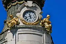 El chaflán se resuelve con una rotonda cilíndrica rematada por un torreón, donde se acumulan los elementos más importantes del diseño. En el basamento aparecen tres huecos rematados en arcos de medio punto, sobre los cuales continúa la balaustrada corrida de la planta principal, sustentada por cabezas de elefantes. En el cuerpo intermedio se adosan a fachada cuatro columnas pulimentadas de granito rojo de doble altura con basas y capiteles de bronce, entre las cuales aparecen los balcones de plantas segunda y tercera, así como un gran nicho con remate semicircular que en origen acogía la escultura de La prevención de la orfandad y la viudez, tabicado en 1920 para colocar el rótulo institucional del banco. Sobre la hornacina se sitúa el tarjetón en el que se ubicaba el primitivo rótulo corporativo de La Equitativa. Tras el pequeño cuerpo de planta cuarta añadido en 1955, en el que se duplica la imposta decorada de fachada y se añaden cuatro pilastras-ménsula prolongando las columnas, el cuerpo superior recupera las ventanas geminadas del resto de las fachadas y la gran cornisa de remate, mientras que la balaustrada general se transforma en historiado frontispicio con las dos alegorías del Pasado y el Porvenir —simbolizadas respectivamente por sendas matronas con un reloj de arena y la rueda de la Fortuna—[7] en bronce dorado flanqueando un reloj. El torreón es un elemento singular por su original y cuidado diseño y por la nobleza de sus materiales, hierro, cobre y fundición. Sobre un fuste troncocónico de generatriz cóncava se sitúa una plataforma circular con barandilla a modo de mirador. La parte superior es un esbelto templete de finas columnillas con cúpula bulbosa.
