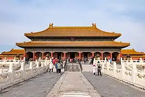 Sobre el trono cuelga una tableta con una escritura leída de derecha a izquierda, que dice zhèng dà guāng míng (正大光明), escrita por el Emperador Shunzhi. Esta tableta se ha traducido en varias formas, pero el significado transliteral aproximado es "dejen que el bondadoso brille". A menudo se usa como una frase o aforismo chino, que significa "ser decente, sincero y magnánimo," o "no tener ningún secreto ni hacer una acción desvergonzada."