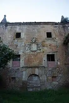 En la parte trasera del edificio principal y adosado a él, encontramos el torreón, con cuatro machones o cubos circulares y una puerta de medio punto con el lema familiar: Arbor bona, bonos fructus fecit.