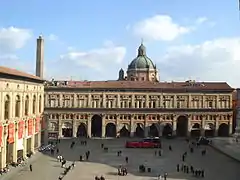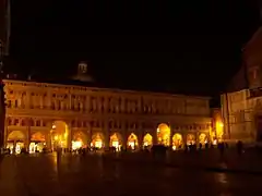 Construido en 1412, fue completado en 1568 por el arquitecto Jacobo Barozzi (llamado el Vignola), quien se ocupó de la actual fachada y del aporticado. De aquí parte el pórtico más famoso, il Pavaglione, que une la Piazza Maggiore con el Palazzo dell'Archiginnasio, primera sede de la Universidad de Bolonia. La solución arquitectónica adoptada garantiza la característica única del entramado urbano dominado por puertas y pórticos que siempre ha distinguido a Bolonia.