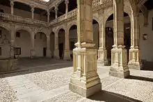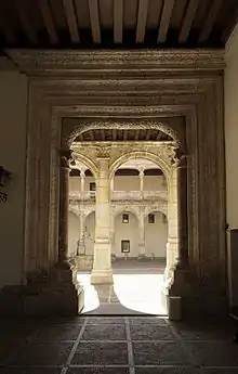 El patio está formado por dos pisos de diferente diseño debidos probablemente, a distintos arquitectos,[2]: 519 así el inferior presenta pilares aupados sobre altos podios, decorados con pilastras pseudocorintias que sostienen arcos de medio punto, y el superior de menor altura, columnas y arcos carpaneles con medallones en las enjutas. Mientras que el primero refleja influencias tardogóticas el superior es de estilo renacentista.[Nota 7]