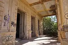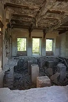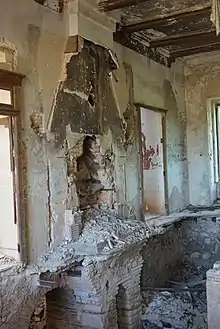 En el interior, entrando por la puerta principal, nos encontramos con una gran entrada y una chimenea de carbón. También hay una escalera imperial, que está muy deteriorada, y otra escalera de caracol. El mobiliario fue saqueado y las decoraciones de techo y paredes están en muy mal estado.