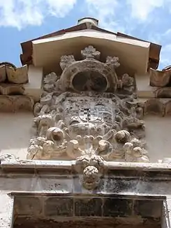 Posee una fachada con profusión de balcones y ventanas y una portada con molduras y un portón de acero arquitrabado en el que aparecen elementos barrocos y un gran escudo de armas en el remate.