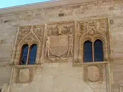 Las ventanas altas son casi todas iguales entre sí y todas ellas tienen mainel o parteluz, en el que apean los arquillos, que fueron lobulados y actualmente son gemelos de medio punto. De las cinco, cuatro quedan inscritas en un alfiz rectangular con cardinas y sólo la de la izquierda queda cobijada por uno finalizado en arco conopial; además de la hojarasca gótica que también aparece en las otras, luce sobre ellos unos niños luchando y dos torpes bustos en el pretil, de cuyo reborde superior nace una imposta que subdivide toda la fachada, siguiendo los gustos del gótico de los Reyes Católicos. Otros motivos ornamentales de estas ventanas son dragones y extraños animales. Las del cuerpo bajo son más sencillas. Tienen alfiz decorado con pomas o bolitas, y finalizado en conopio con venera en el centro, corriendo a todo lo largo por debajo una cadena labrada en la piedra que nace de las cabezas de león, no constando si es en virtud de algún privilegio concreto o si es mera decoración para subdividir la superficie, a lo que tan dados eran los decoradores hispano-flamencos.
