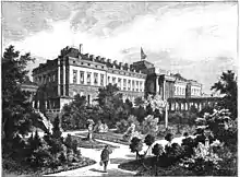 Los estados, que no aceptaron fácilmente la necesidad de un nuevo edificio, solo fueron persuadidos luego de una larga discusión para aceptar pagar por ello. El edificio finalmente se erigió en 1777-1793 en una nueva sección de Coblenza llamada Neustadt. El arquitecto jefe original fue el parisino Pierre Michel d'Ixnard, que ya había diseñado varios edificios en el sur de Alemania. Un primer borrador de los planos hechos en 1776 por otros había sido un diseño en forma de herradura más alejado del río y más al norte, frente al centro antiguo de la ciudad; probablemente a petición de Clemens Wenceslaus, d'Ixnard cambió el sitio y la orientación. Sin embargo, después de criticar sus planes, se encargó un informe a la Academia de Arquitectos de París, que confirmó algunas de tales críticas. Lo dejaron ir el 18 de diciembre de 1779 y fue reemplazado por recomendación de la Academia por otro arquitecto francés, Antoine-François Peyre el Joven, cuyos planos modificados fueron presentados en 1780[2] y presentaban una edificación más pequeña y simple que fue la que se construyó. El exterior se completó en 1784.[1]