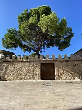 Por otro lado, el palacio llama la atención por una escala imperial elaborada con piedra calcárea y una columna robusta, que actúa como soporte de una marquesina elaborada con tejas árabes. También, cuenta con un patio de armas cerrado con una muralla con almenas.
