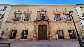 El palacio se muestra al exterior a través de una alargada fachada de dos cuerpos de altura, de sillares y ladrillo con paramentos de mampostería respectivamente. El primer cuerpo presenta ventanas con marcos rehundidos con orejeras, y el segundo balcones enmarcados por pilastras y frontones rotos con aparatosos remates piramidales. Distintos motivos ornamentales contribuyen a dotar de una especial riqueza a esta fachada, donde el principal elemento es su espléndida portada de mármoles polícromos situada en el centro. Su amplio hueco de entrada se enmarca entre solemnes columnas corintias de altos pedestales y decoración geométrica. Entre ellas se crea un balcón volado, con un rico diseño a base de estípites y un coronamiento mixtilíneo con blasón, más una serie de pirámides de formas abultadas.[7]