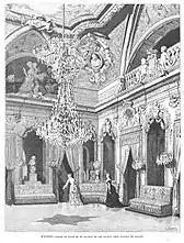 Los planos y la dirección de la construcción del edificio fueron ejecutados por el arquitecto francés Adolfo Ombrecht. Su interior tenía un salón de baile decorado con flores, una capilla para eventos religiosos, una sala de billar, una sala de retratos, baños decorados en estilo pompeyano por el pintor Oreste Mancini, una galería museo, una sala de música y un gran número de dependencias. El mármol de Carrara se usa mucho, y hay tapices y pinturas de Francisco de Goya, Vicente López, Palmaroli, Eduardo Rosales, Murillo, Pradilla, Madrazo, Gisbert, Casado del Alisal, etc., siendo los escultores los muebles más famosos de Benlliure, ébano y marfil, coloridos candelabros y ventanas.[2]