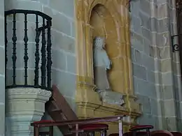En el lado del Evangelio, en el presbiterio, se halla el cenotafio con estatua orante del fundador Lorenzo de Rugama.