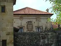 El escudo es al gusto barroco con lambrequines que llevan unos guerreros como tenantes, con decoración de amorcillos y otros personajes. Está cuartelado y en cada parte figuran las armas de la familia Rugama. Este escudo se repite en la portalada y en la fachada del palacio.