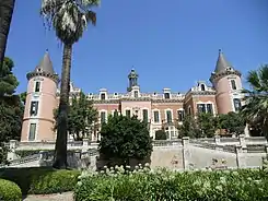 El palacio se encuentra en lo alto de un promontorio al que se accede a través de una serie de terrazas ajardinadas, con rampas y balaustradas elaboradas al estilo del jardín italiano renacentista. Los jardines, diseñados por Adrià Piera, se estructuran en cada nivel alrededor de unos estanques centrales con surtidores de agua, y en el espacio circundante se sitúan unos parterres de broderie rodeados de especies arbóreas como palmeras, magnolias y castaños de Indias. Hay también rosales y macetas de terracota con geranios.[2] Los jardines fueron restaurados en 1999 por Patrizia Falcone y abiertos al público.[3]