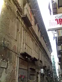 El palacio ocupa una longitud de alrededor de dos manzanas del casco antiguo. La fachada presenta características del siglo XVI, mientras que el basamento del edificio, que resulta completamente alterado por las aberturas de las tiendas, se remonta al siglo XV; las ventanas son divididas rítmicamente por lesenas que terminan en la cornisa sobresaliente.[3][1]