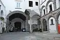 - El patio hacia el lado trasero, con el escudo de la familia Carafa, el fresco y la cabeza del caballo.