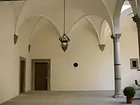 La habitación que da al jardín tiene una notable artesonado y a lo largo de la pared hay un fresco: Pazzino de 'Pazzi cruzando los muros de Jerusalén, y también dos pinturas con temas religiosos: la Última Cena y el Lavatorio de pies.