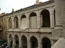 En el palacio propiamente dicho (construido a partir de 1466) se produjo una recuperación más fiel de los modelos antiguos, que demuestra una gradual comprensión más profunda. El vestíbulo con la bóveda a casetones registra el primer ejemplo de uso en la arquitectura moderna del vertido de hormigón a la antigua, sobre encofrados, tomado del Panteón o de la basílica de Majencio.[5] La logia del patio principal retoma de manera fiel el esquema del exterior del Coliseo o del Teatro de Marcelo, con órdenes superpuestos y semicolumnas adosadas sobre los pilares entre los arcos.[4]
