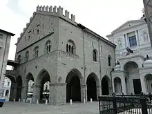 Al igual que otros palacios comunales italianos construidos en la época medieval, tiene una planta baja abierta por tres lados (originalmente dos) mediante pórticos. Estos pórticos están dotados de una logia con arcos apuntados y de medio punto, con pilares portantes perimetrales y columnas del siglo XVI en el centro. Los pilares están decorados con capiteles que muestran elementos decorativos de estilo románico, entre ellos elementos zoomorfos (leones, pájaros y monos) y antropomorfos.