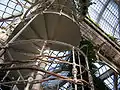 De hierro forjado, se apoya en columnas de hierro fundido en el interior del edificio.