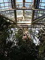- Tradicionalmente, la palmera más grande se coloca en el centro del edificio o, para ser más precisos, la palmera más grande solía colocarse allí . Su crecimiento se convierte en un problema en cuanto amenazan con alcanzar el techo de cristal. En 1909, palmera María-Teresa [7] llegó a este tamaño por primera vez. Durante un tiempo, fue tirado en ángulo por cables de acero, pero finalmente tuvo que ser cortado. LLa posibilidad de elevar la estructura, ya catalogada, con el permiso personal del Emperador, también quedó descartada por razones de coste. con 18 En febrero de 2008, uno de sus sucesores corrió la misma suerte, a saber, la palma de Sisi, posiblemente de 170 años. [8] Aunque originalmente se plantó en un barril de madera, lo atravesó y luego se enraizó tan profundamente en el suelo que ya no se pudo transportar durante la renovación general. En 2007, su parte superior alcanzó la linterna de la casa de cristal. [9]