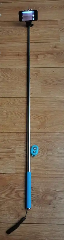 Los palos de metal son típicamente extensibles, con una correa en un extremo para la muñeca y una abrazadera ajustable en el otro extremo para que mantenga el dispositivo fijo en su lugar. Algunos tienen controles remotos o Bluetooth, permitiendo al usuario decidir cuándo tomar la imagen, e incluso los modelos diseñados para las cámaras digitales tienen un espejo detrás de la pantalla de visión para que el tiro pueda ser alineado.[9][10]