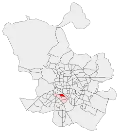 ![]() Palos de la Frontera (rojo) en el distrito de Arganzuela (rosa) y en el término municipal de Madrid (gris) | ||