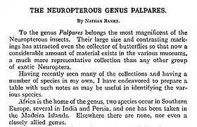 Párrafos introductorios del trabajo The neuropterous genus Palpares (1913) de Banks, N.