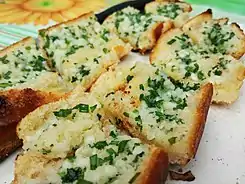 Es frecuente elaborarlo con panes tales como las baguetes o el pan italiano, cortado en rebanadas hacia la base pero dejando la pieza sin terminar de romper. El pan se rocía entonces con aceite de oliva, y se añade ajo picado o en polvo entre las rebanadas. A continuación se cuece en un horno. Alternativamente, puede cortarse en rebanadas separadas y cubrirse con aceite o mantequilla individualmente. Se suele espolvorear con perejil picado.