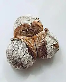 Contiene harina panificable (~W130), agua, masa madre, levadura y sal.[1] Se amasan los ingredientes y se forma una barra grande de pan. Entonces, se pliega por la mitad y el panadero, con ayuda de todo su antebrazo, aplasta y pliega la masa hasta formar sus tres lóbulos. Una vez boleada la masa, se deja fermentar boca abajo. Se le da la vuelta justo antes de meterse al horno, donde se abre definiendo los tres moños.