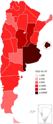 El primer caso confirmado de la pandemia de COVID-19 en Argentina se dio a conocer el 3 de marzo de 2020.[2][3] El 17 de junio de 2021, se confirmaron 4 222 400 casos de personas infectadas y 87 789 muertes en total.[1][4] El 29 de diciembre de 2020 comenzó la campaña de vacunación. El gobierno ha estimado en 23/24 millones la población a ser vacunada. [5] Hacia el 20 de febrero de 2022, 40 197 226 personas habían recibido una dosis, representando el 88,59 % de la población total del país, mientras que 36 057 523 personas, el 79,46 % de la población total, recibieron dos dosis.[6] Además, 12 981 098 de personas recibieron una tercera dosis (Adicional o Refuerzo), representando el 28,61 % de la población.