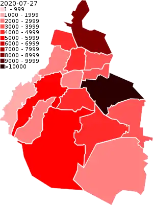 ![]() Hasta el 18 de julio de 2020 hay 62076 casos confirmados de coronavirus en la Ciudad de México. | ||