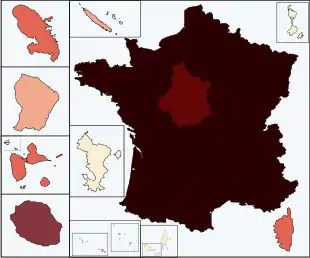 ![]() Departamentos de Francia afectadas por COVID-19: Leyenda 1 - 49 99 casos confirmados 50 000 - 99 999 casos confirmados 100 000 - 199 999 casos confirmados 200 000 - 299 999 casos confirmados 300 000 - 499 999 casos confirmados 500 000 - 699 999 casos confirmados ≥700 000 casos confirmados