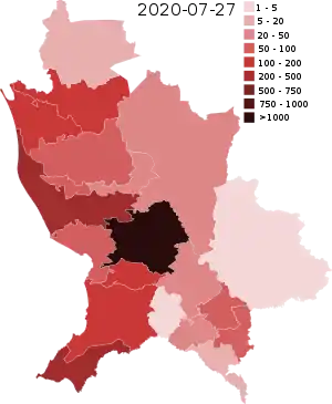 Hasta el 29 de junio, hay 1,717 casos, 196 muertes y 889 recuperados.[1]