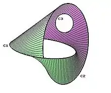 Los "parámetros de torsión" son más difíciles de definir. Corresponden a cuánto se gira al pegar dos pantalones en : esto se define define por el módulo . Se puede refinar la definición (utilizando la continuación analítica [5] o técnicas geométricas) para obtener parámetros de giro valorados en (más o menos, el punto es que cuando se hace un giro completo, cambia el punto en el espacio de Teichmüller al precomponer con un giro de Dehn alrededor de ).