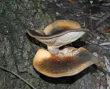 Los cuerpos fructificantes (basidiocarpos) pueden ser vistos en la madera muerta o enferma.[2] Pueden ser vistos durante la noche por su resplandor blanquecino pálido en la base de eucaliptos.[3] El sombrero tiene un color muy variable, algunas veces es color crema aunque también puede ser teñido de naranja, marrón, gris, morado o, incluso, en tonos azul-negro. El borde tiene un tono más ligero, en general, cremoso, si bien las presentaciones marrones tienen tonalidades canela o marrón. Generalmente el centro tiene tonos más oscuros,[4] que suelen ser más intensos en especímenes más jóvenes. Al crecer hasta 30 cm de diámetro, el sombrero adopta una forma de abanico o embudo con bordes enrollados. Las láminas, de color blanco cremoso, son decurrentes[n. 1] y frecuentemente gotean con la humedad;[6] pueden tener hasta 13 mm de profundidad y estar un poco distantes o con espacios estrechos entre sí; también pueden desarrollar un borde liso que se erosiona en la madurez.[7] El estipe puede ser central a lateral en el encaje con el sombrero, llega a medir hasta 8 cm de largo y estrecharse en la base. La carne fina es blanca cremosa,[6] pero puede tener tonos rojizos cerca de la base del estipe. No tiene olor o sabor distintivo. La esporada es blanca.[7]