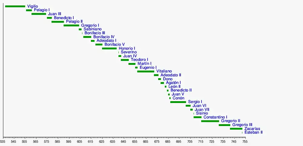El papado bizantino estuvo compuesto por los siguientes papas y antipapas. De los trece papas de 678 a 752, únicamente Benedicto II y Gregorio II eran romanos nativos; todos los demás eran de habla griega, de Grecia, Siria o Sicilia bizantina.[62] Muchos papas de este período habían servido previamente como apocrisiarii papal —equivalente al nuncio moderno— en Constantinopla.[14] La serie de papas desde Juan V hasta Zacarías (685-752) se denomina a veces «cautiverio bizantino» porque únicamente un papa de este periodo, Gregorio II, no era de origen «oriental».[65]