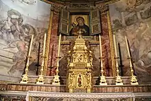 Incluso las tradiciones autóctonas del arte religioso romano se vieron transformadas por la influencia oriental, y el realismo monumental del estilo romano, representado en el ábside de San Cosme y San Damián, fue sustituido por el delicado formalismo de las pinturas de Santa Maria Antiqua, o el icono de la Virgen de estilo bizantino que se encuentra en la iglesia de Santa Francesca Romana. El culto de la propia Iglesia romana estaba siendo transformado por la influencia oriental.[80]